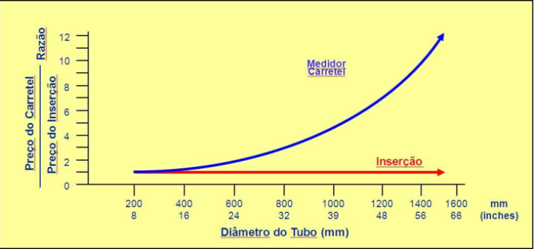 Apesar de ser um medidor de vazão quase perfeito, o medidor eletromagnético tipo carretel tem como uma de suas desvantagens o aumento do custo do produto em razão do diâmetro, bem como o elevado custo de sua instalação em grandes diâmetros de rede, tornando-a às vezes, inviável economicamente. Em razão deste aspecto, ou seja, a inviabilidade econômica de instalação dos grandes medidores eletromagnéticos de vazão tipo carretel, fez com que alguns fabricantes de medidores eletromagnéticos partissem para o desenvolvimento dos medidores eletromagnéticos tipo inserção.