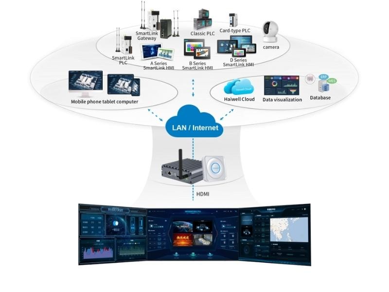 O Haiwell TVBOX é uma equipamento para visualização em telas grandes que fornece gerenciamento centralizado de Haiwell HMI/BOX/SCADA/IoT PLC/câmera de vigilância e bela visualização de dados para tela grande para mostrar as principais informações, incluindo dispositivo, projeto, alarme, vídeo e vigilância.