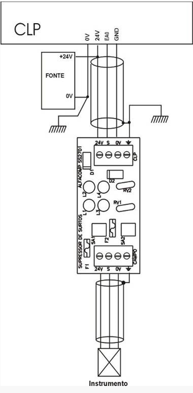 O módulo Alfacomp SS2701 constitui um protetor de canais analógicos contra surtos elétricos causados por sobre tensões na fiação de campo. Montado em circuito impresso e alojado em suporte plástico para fixação em trilho DIN, o módulo incorpora dois circuitos de proteção contra surtos, sendo um para evitar que surtos danifiquem o circuito de alimentação em 24V e o outro para proteção de um canal analógico.