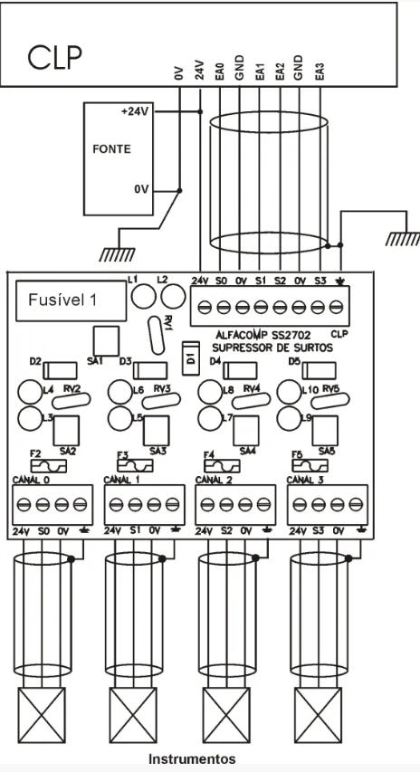 O módulo Alfacomp SS2702 constitui um protetor de canais analógicos contra surtos elétricos causados por sobre tensões na fiação de campo. Montado em circuito impresso e alojado em suporte plástico para fixação em trilho DIN, o módulo incorpora cinco circuitos de proteção contra surtos, sendo um para evitar que surtos danifiquem o circuito de alimentação em 24V e os outros quatro para proteção de canais analógicos.