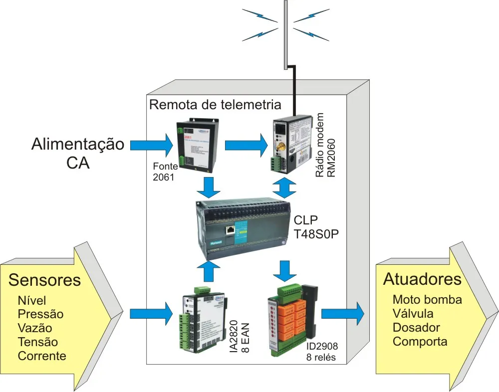 Nos reservatórios e elevatórias são instalados painéis de telemetria dotados de controladores programáveis, rádios modem e demais componentes.
