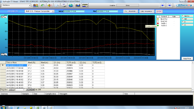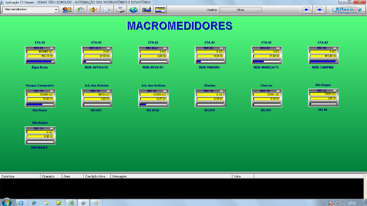 Fundamental no combate às perdas, a comparação entre a macro medição e a micro medição direciona o trabalho das equipes que “caçam” os vazamentos e rupturas de adutoras. A tela dos macro medidores apresenta as leituras instantâneas de vazão, assim como os volumes acumulados desde o último zeramento dos mesmos.
