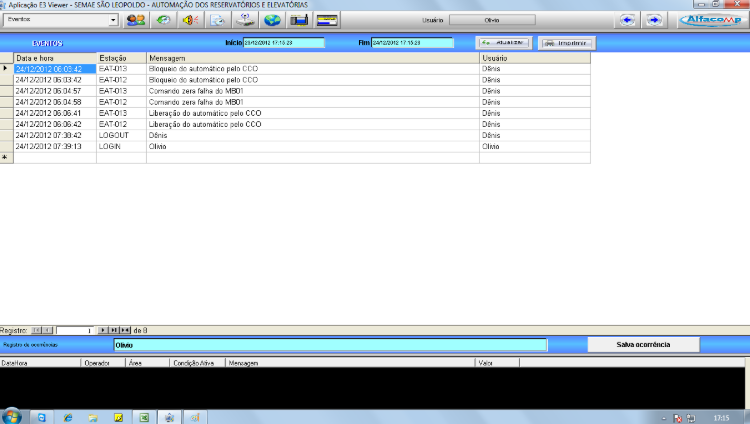 Ocorrências como o ligamento e desligamento de bombas, abertura de válvulas, comando dados pelos operadores e demais ações normais à operação, são apresentados na tela de Eventos, juntamente com o nome do operador.