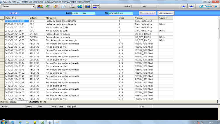 A tela dos alarmes apresenta as ocorrências de anomalias, identificando a estação, o problema e o operador.