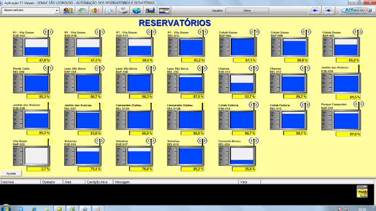 Na tela dos reservatórios se pode acompanhar em tempo real o nível dos mesmos, assim como ajustar os pontos de ligamento e desligamento das bombas que os abastecem. Os dados são atualizados em, no máximo, 15 segundos.