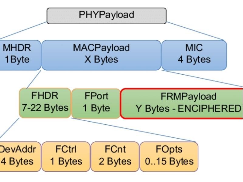 A carga útil MAC das mensagens de dados consiste em um cabeçalho (FHDR) seguido por um campo opcional de porta (FPort) e uma carga útil de opcional (FRMPayload).
