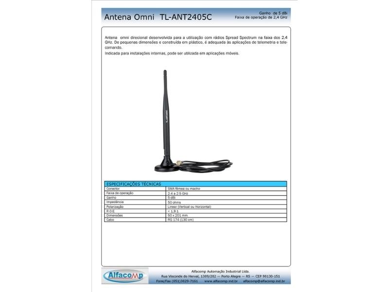 Antena omni direcional desenvolvida para a utilização com rádios Spread Spectrum na faixa dos 2,4 GHz. De pequenas dimensões e construída em plástico, é adequada às aplicações de telemetria e telecomando. Indicada para instalações internas, pode ser utilizada em aplicações móveis.