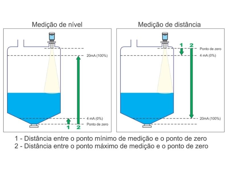O nível é finalmente convertido em sinal 4 a 20mA, sendo o valor de 4mA indicador do nível mínimo e o 20mA indicador do nível máximo.
