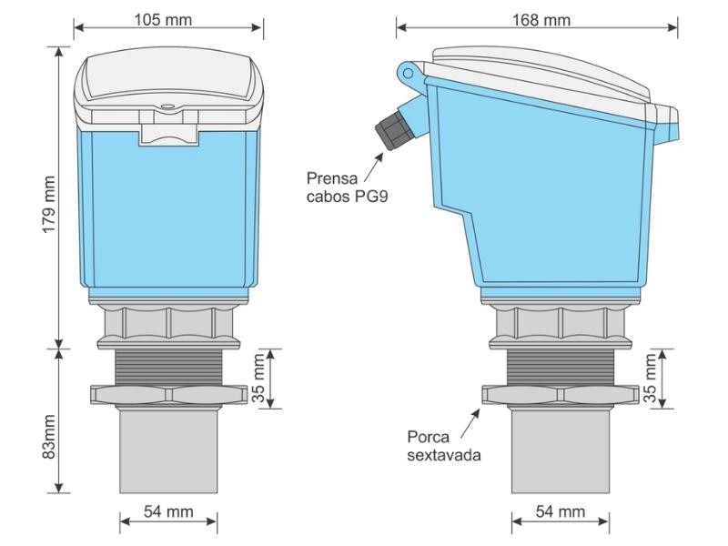- O transmissor ultrassônico é instalado no topo do reservatório, acima do nível máximo do líquido. Os pulsos ultrassônicos são emitidos pelo transmissor e refletidos pela superfície do líquido.