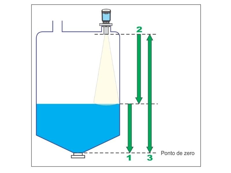 No exemplo da figura, um transmissor de nível ultrassônico é fixado no topo de um tanque parcialmente cheio de líquido. O nível de referência para todas as medições é o fundo do tanque. O nível medido será o da superfície do líquido que está a uma certa distância do sensor ultrassônico de nível. Sinais de pulso ultrassônicos são transmitidos pelo transmissor e refletidos de volta para o sensor.