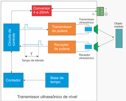 O nível é calculado com base no tempo medido entre a emissão do pulso e a recepção da onda refletida. Ao nível do mar em temperatura de 20° C a velocidade do som é 344 m/s.