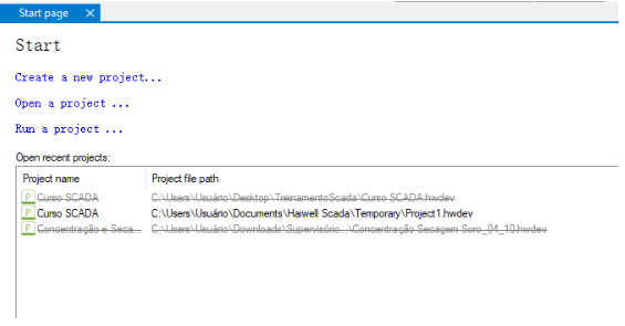 Ao abrir o SCADA Develop pela primeira vez, será exibido esta página, para que você selecione abrir um novo projeto, um projeto em andamento ou apenas rodar a aplicação para testes.