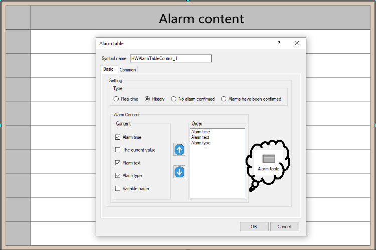 Agora na tela alarme, vamos inserir o objeto tabela alarme Graphics library > Advanced Controls > Alarm table.