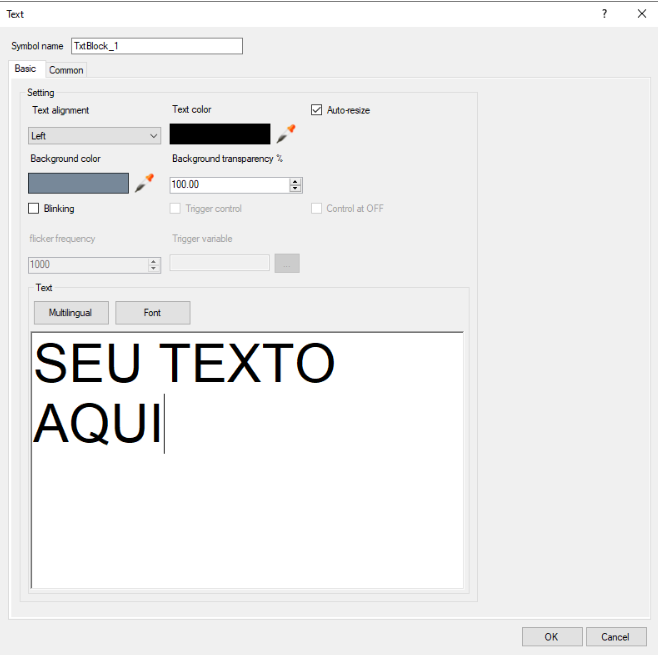 Conforme a figura, clique em read variable, e selecione na lista a variável Nível_TQ1 para este objeto, deixe o valor máximo em 100 e o mínimo em 0, para que o reservatório varie nos mostrando no cursor, mude o fill color para a cor azul para que faça alusão a água.