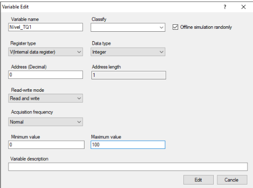 Operation: modo como a variável vai operar no sistema. neste item vamos fazer alguns ajustes, para poder usar a variável em modo simulação: