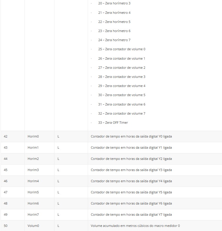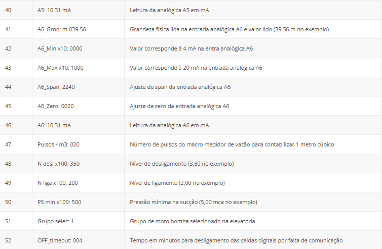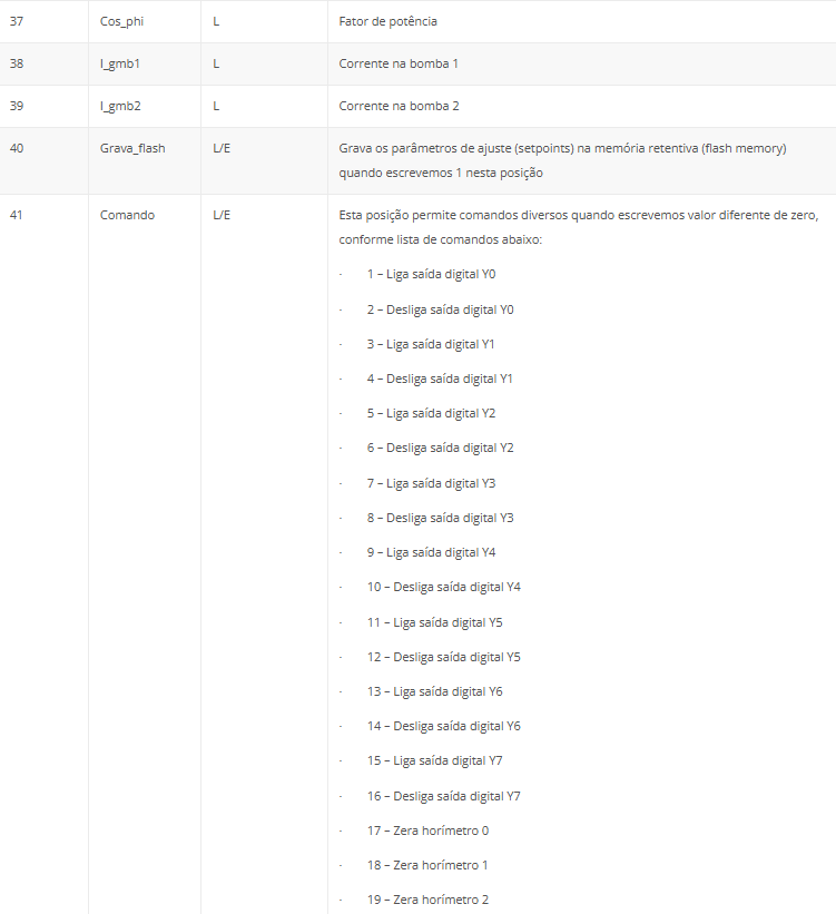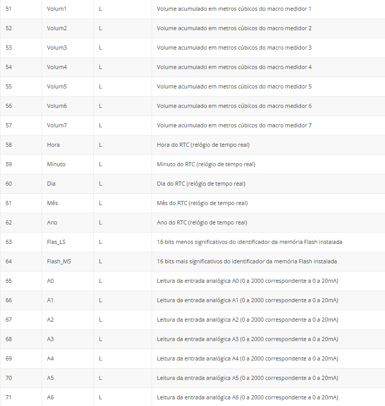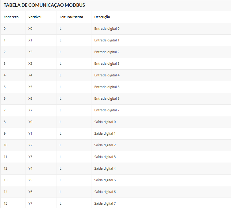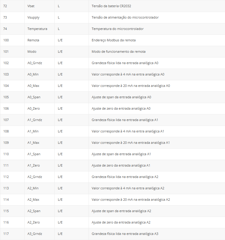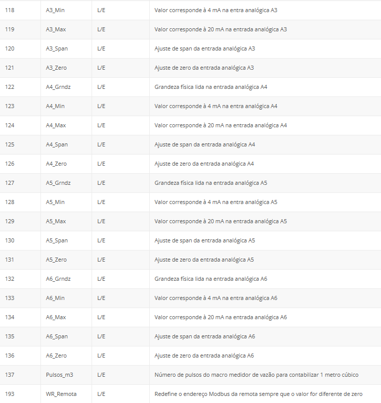 A tabela a seguir apresenta os endereços e variáveis de comunicação da remota no protocolo Modbus.