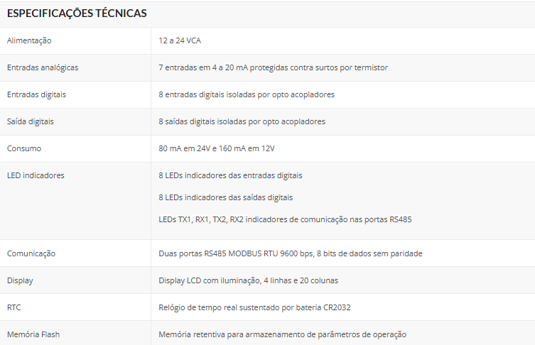 - 2 canais RS485 MODBUS RTU;