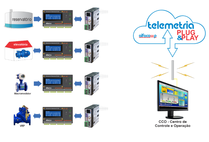 Monitoração e controle dos reservatórios e estações elevatórias de água e esgoto, ETAs (Estações de Tratamento de Água), ETEs (Estações de Tratamento de Esgoto) e demais pontos de interesse como Boosters (Estações de Pressurização), VRPs (Válvulas Reguladoras de Pressão) e pontos de medição de pressão e vazão da rede de distribuição de água tratada. Todo o controle se dá no CCO (Centro de Controle e Operação).