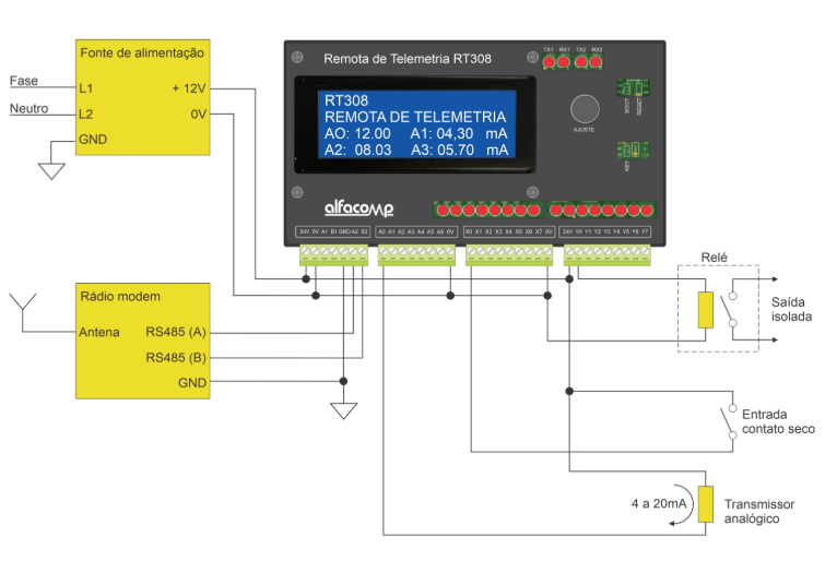 Alimentação: O diagrama apresenta o módulo RT308 alimentado por uma fonte de 12V. O consumo típico do módulo é de 160 mA em 12V e 80 mA em 24V. Para dimensionar a fonte, leve em consideração os demais dispositivos periféricos.