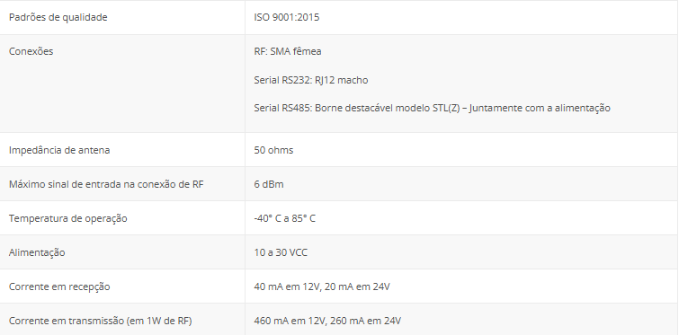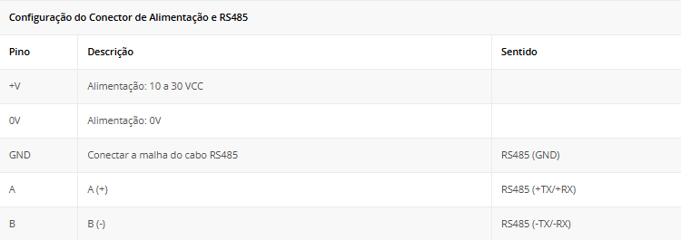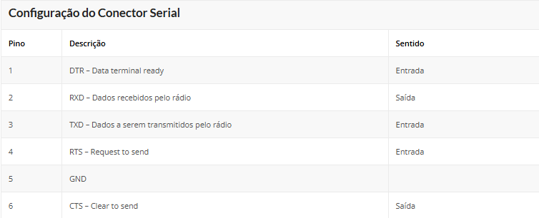 A porta serial RS485 está presente no mesmo conector utilizado para alimentar o rádio. O conector é do tipo STL(Z) da Phoenix Mecano A pinagem do conector é apresentada na tabela que segue.