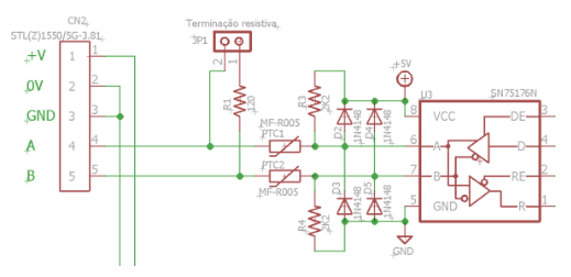 O circuito parcial a seguir, apresenta as conexões internas da porta RS485. Observe-se que os sinais A e B da conexão seria RS485 são protegidas contra sobre tensões por diodos e termistores. O Jumper JP1 conecta a terminação resistiva de 120 ohms. Esta terminação deve ser utilizada nas pontas da rede RS485. Consulte as normas EIA para saber mais sobre este padrão serial.