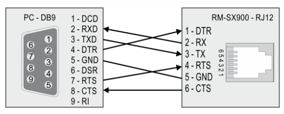 O transceptor RM-SX900 é chamado DCE (Data Communication Equipment). Um DCE pode ser conectado a um DTE (Data Terminal Equipment), por exemplo, um PC, através de um cabo serial cuja configuração é apresentada abaixo.