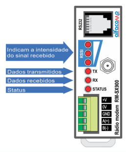 O rádio modem RM-SX900 possui conectores e LEDs que facilitam a instalação e utilização. A fixação em trilho DIN e o formato vertical contribuem para a economia de espaço no painel de telemetria.
