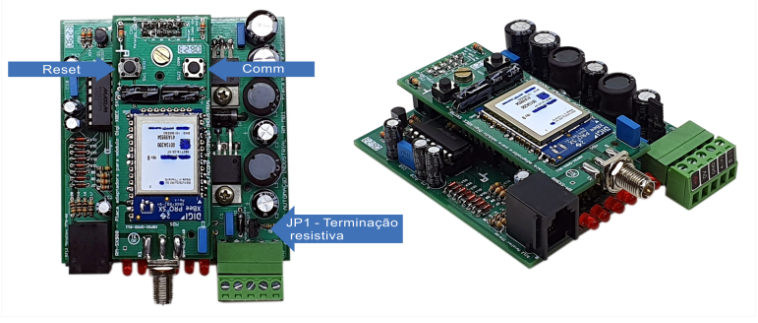 O equipamento é composto por duas placas eletrônicas como mostrado abaixo. A figura apresenta a localização do jumper da conexão resistiva e dos botões de RESET e COMM.