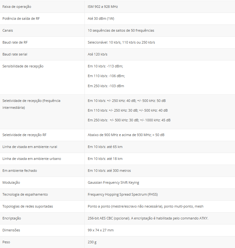 O alcance do rádio modem é de até 65 km em linha de visada. O equipamento foi projetado para o bloqueio de interferências, permitindo o uso em aplicações que exigem a combinação de alcance, redundância e confiabilidade de dados.