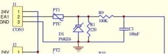 Condicionador de entrada – Cada sinal analógico de entrada é condicionado por este circuito. O termistor PTC funciona como um fusível rearmável que “abre” quando o sinal de 4 a 20 mA ultrapassa 50 mA, protegendo o circuito sensor. O diodo TVS protege contra sobre tensão. O resistor de 220 ohms é sensor de entrada e R9 e C1 funcionam como filtro passa baixa.
