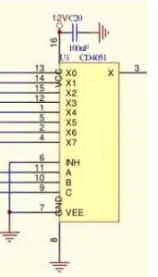 Chave analógica multiplex – IA2820 - Entrada analógicaO circuito integrado CD4051 recebe os 8 sinais analógicos nas entradas X0 a X7 e repassa o sinal selecionado na saída X.