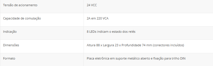 EsID2908 – Isolador a relé para 8 saídas digitaiste dispositivo foi projetado para criar 8 saídas a relé isoladas para utilização com CLPs de saída a transistor em 24 VCC. A montagem vertical do módulo isolador permite termos 8 relés em apenas 23 mm do trilho DIN.