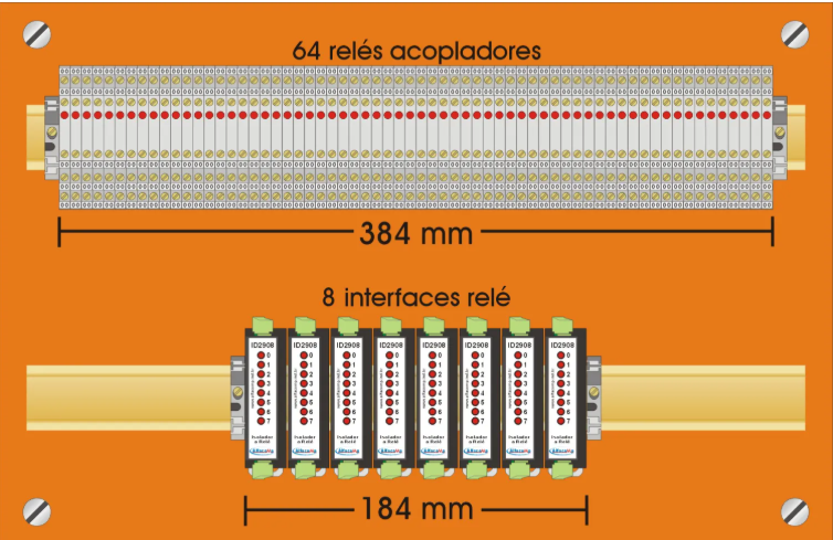 Na busca constante por competitividade e redução de custos, a indústria de componentes eletro-eletrônicos procura oferecer dispositivos cada dia mais compactos, viabilizando assim montagens de quadros de comando menores e mais econômicos. Boa parte da área de um painel elétrico com muitas saídas digitais é destinada aos relés. Pois bem, imagine reduzir pela metade o espaço ocupado pelos relés no quadro de comando. Considerando relés medindo 6 mm de largura, por exemplo, 64 relés enfileirados irão ocupar 38,4 cm. Com o ID2908, 64 relés ocupam apenas 18,4 cm.
