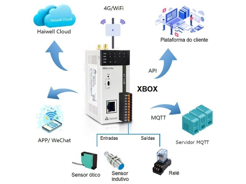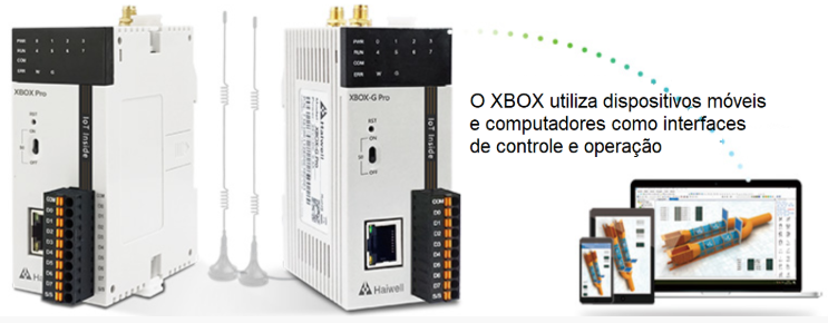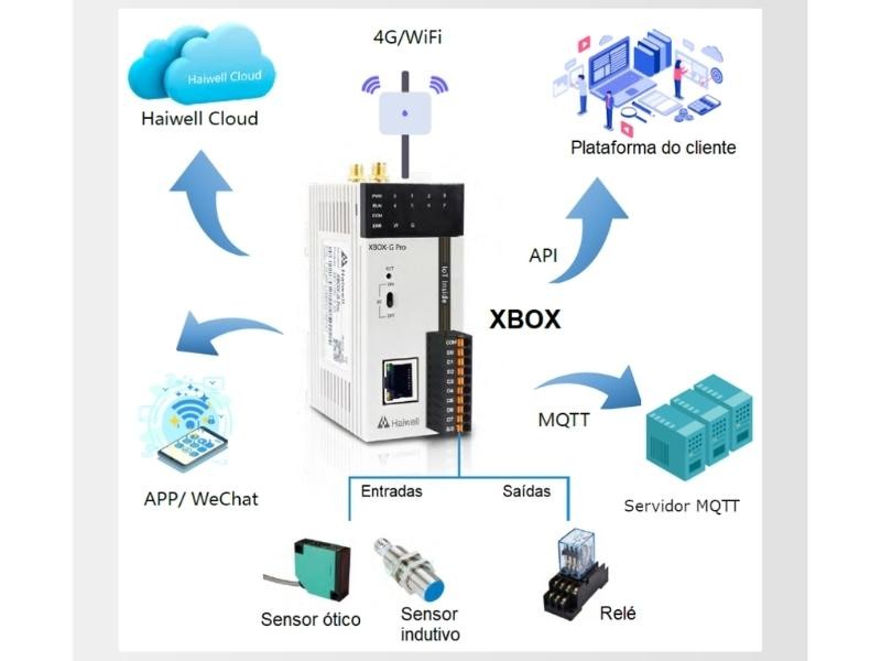 Além de possuir a porta Ethernet e funcionar como um CLP+IHM, o XBOX é dotado de pontos de E/S configuráveis e realiza coleta e transmissão de dados em tempo real. O XBOX pode se conectar à plataforma Haiwell IoT Cloud por meio de WiFi/Ethernet/4G de várias formas, pode enviar dados para o servidor Cloud e ser configurado e gerenciado remotamente por meio da plataforma IoT.