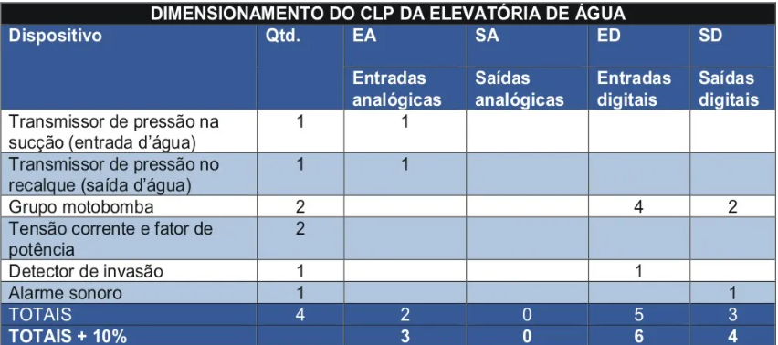 Uma das etapas na definição de um sistema de automação é o dimensionamento do CLP. Para tanto, devemos relacionar os dispositivos envolvidos no sistema e listar para cada um o número de entradas e saídas analógicas e digitais necessárias para o comando e monitoração.