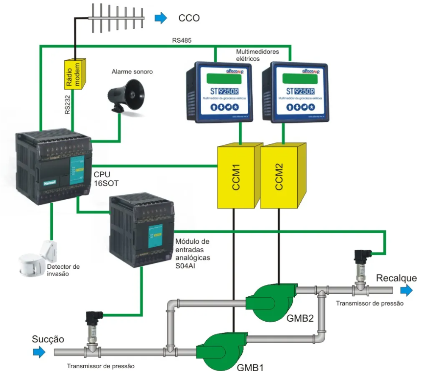 - Medição de tensão, corrente e fator de potência dos grupos motobomba por multimedidores de grandezas elétricas, um por grupo, comunicando por RS485 com o CLP;