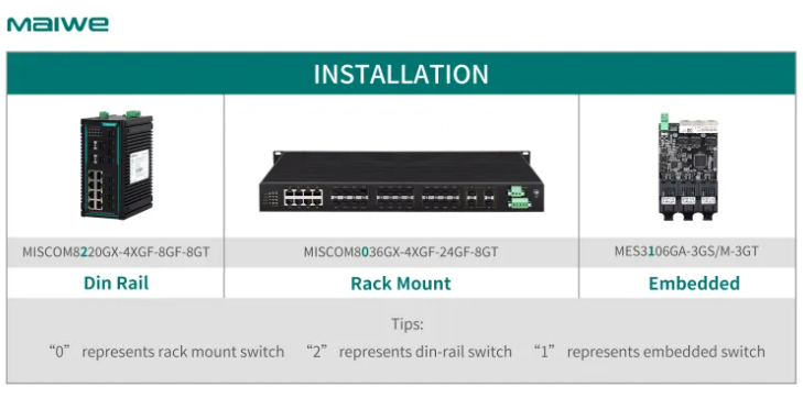 A Alfacomp oferece uma variedade de switches com opções de montagem distintas, facilmente identificadas pelo segundo dígito no nome do produto. Por exemplo, 0 indica um switch de montagem em rack, 1 significa um switch embutido e 2 representa um switch de trilho din.