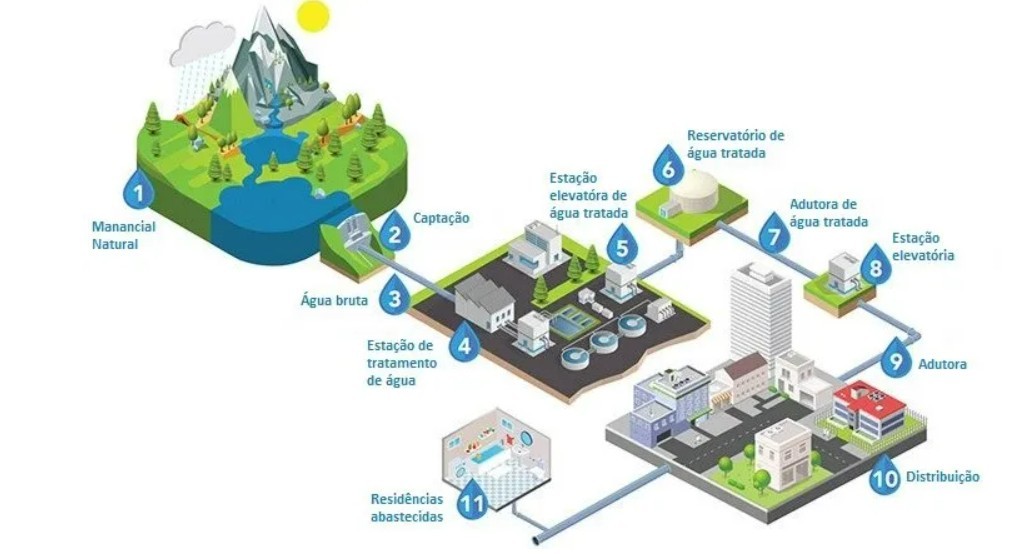 Apresentamos a topologia básica dos sistemas municipais de água com suas estações de captação de água bruta, estações de tratamento, estações elevatórias, reservatórios, boosters e demais pontos de controle e monitoração.
