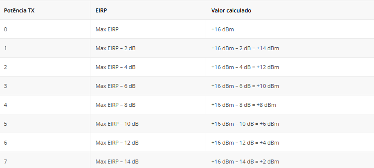 A tabela a seguir mostra a lista de valores EIRP que podem ser usados para transmitir dados.