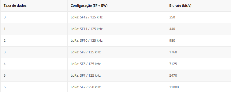 A taxa de dados é o número de bits transmitidos por unidade de tempo. Com a modulação LoRa, a taxa de dados depende de alguns fatores como fator de espalhamento, largura de banda e taxa de codificação. A tabela a seguir mostra a taxa de bits para cada taxa de dados (DR0 – DR6) configurada com o fator de espalhamento e a largura de banda.