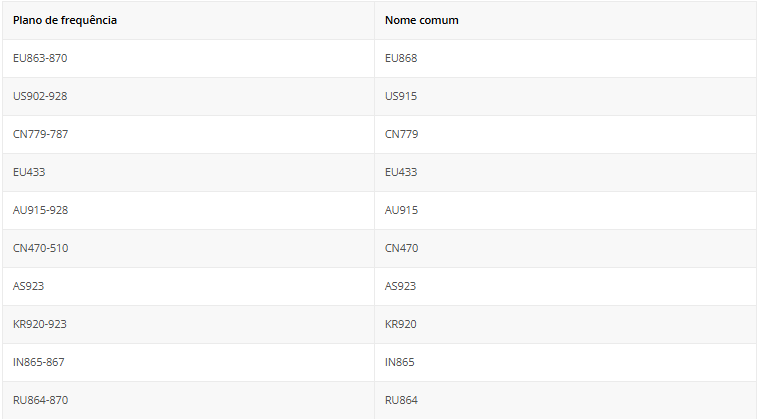 LoRaWAN opera nas bandas ISM (Industrial, Scientific, and Medical) não licenciadas. A tabela abaixo lista os planos de frequência mais recentes e seus nomes comuns.