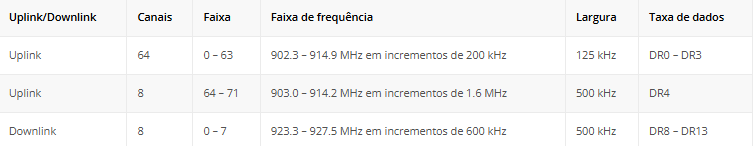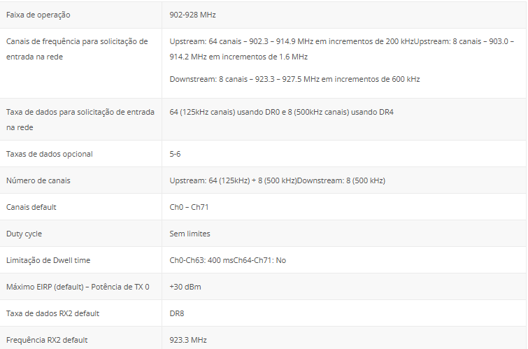 A tabela a seguir resume todos os parâmetros importantes para a banda US902-928.