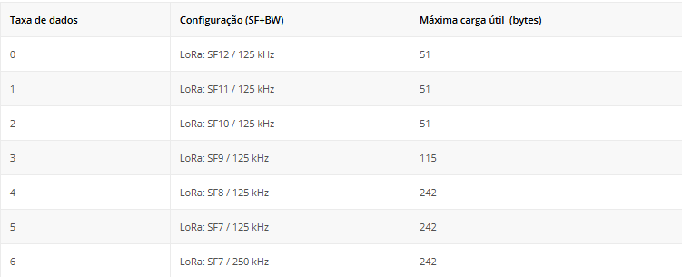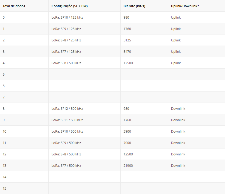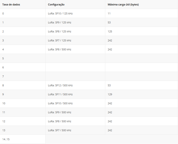 DR0 – DR4 e DR8 – DR13 são usados para modulação LoRa.