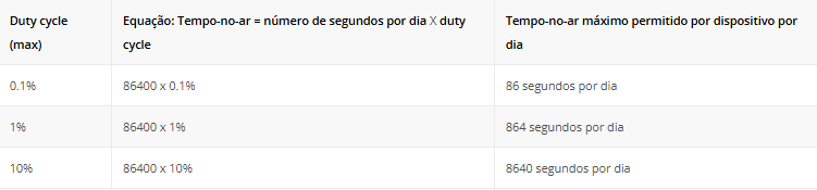 O Instituto Europeu de Normas de Telecomunicações (ETSI) define o ciclo de trabalho máximo para a frequência EU863-870 em 1%, que é o tempo máximo que um dispositivo pode passar em comunicação. Vamos dar uma olhada em como calcular o tempo no ar permitido por dia (24 horas), por dispositivo final para alguns ciclos de trabalho comuns.