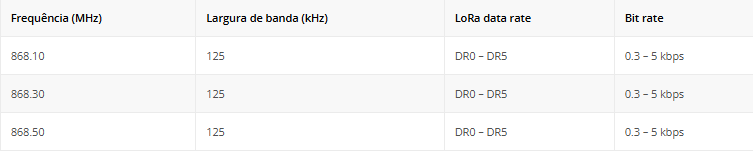 Os três canais padrão a seguir devem ser implementados em todos os dispositivos finais que suportam a banda EU863-870. Esses canais são usados pelo dispositivo final para transmitir a mensagem de solicitação de adesão. O dispositivo final seleciona aleatoriamente um dos canais padrão para enviar a mensagem de solicitação de adesão.
