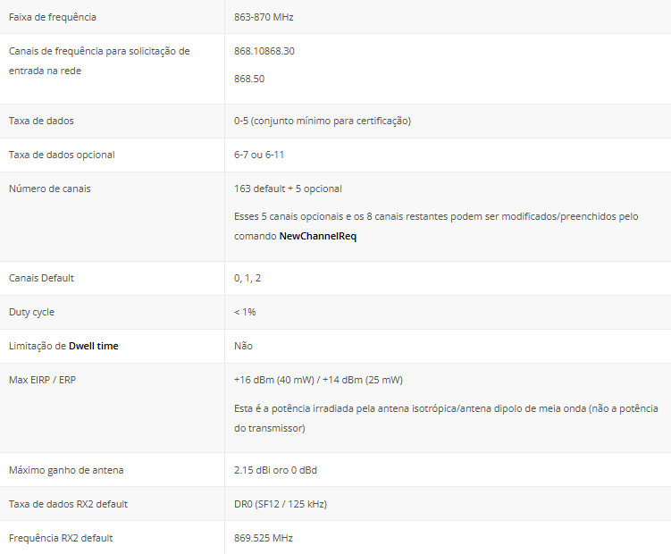 A tabela a seguir resume todos os parâmetros importantes para a banda EU863-870.