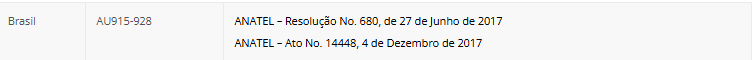 AU915-928: Aplica-se à Austrália e a todos os outros países cuja banda se estende de 915 a 928 MHz. Não há limitação de ciclo de trabalho aplicável e a limitação do tempo de permanência é de 400 ms. O EIRP máximo padrão permitido é +30 dBm.