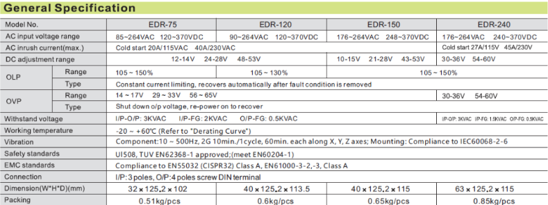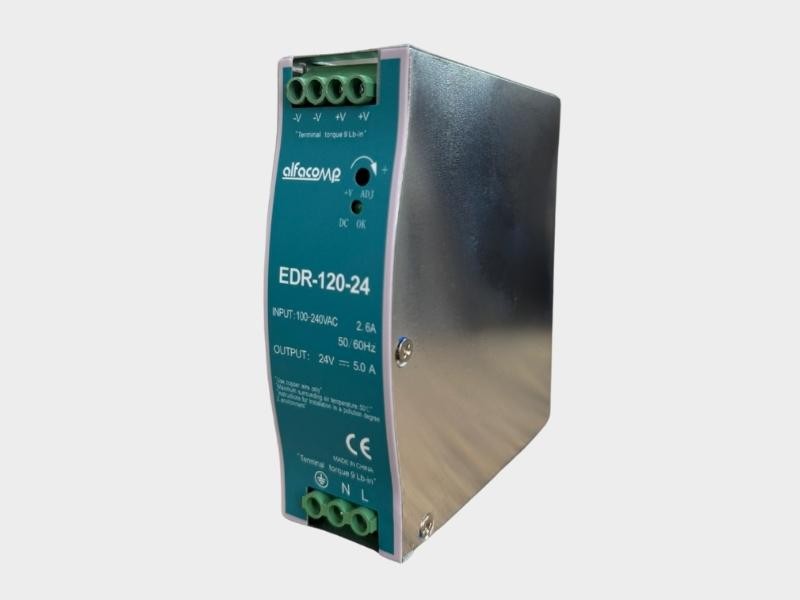 A EDR-120-24 – Fonte Chaveada Industrial Alfacomp, 120W, 24V foi desenvolvida para aplicações de automação em ambiente industrial, tais como a construção de máquinas, controle de processos, automação predial e construção naval, entre outros. Possui proteção contra curto-circuito e sobrecargas de corrente e tensão. O projeto eletrônico garante alta eficiência, longa vida útil e alta confiabilidade. A saída pode ser ajustada em até 10% da tensão nominal.