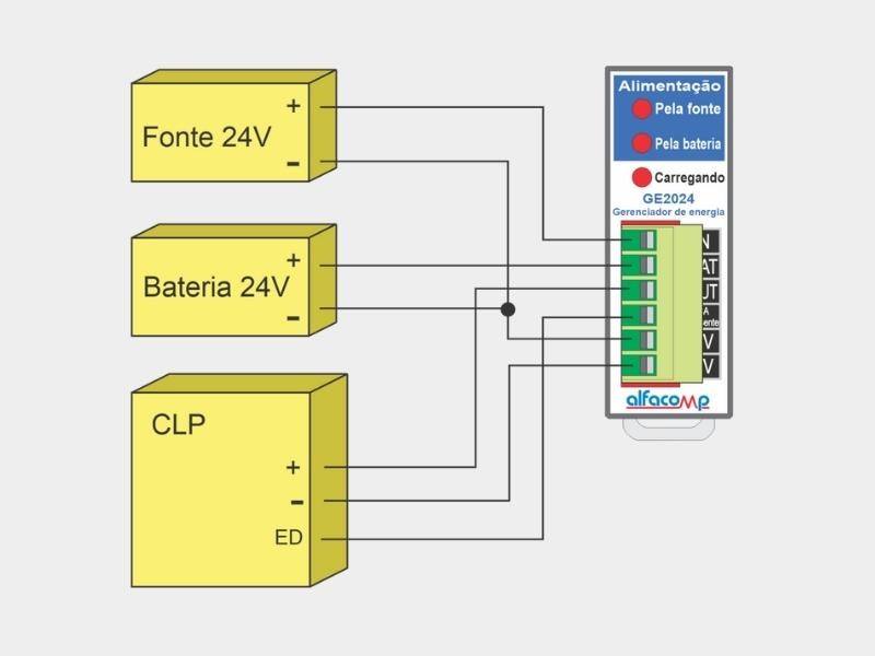 | Indicação de funcionamento | Sinal digital em 24VCC indicando a presença de energia na entrada CA da fonte de 24V. Pode ser ligado à entrada digital de um CLP para alarmar falta de energia na rede da instalação e informar que a bateria está suprindo a alimentação. |