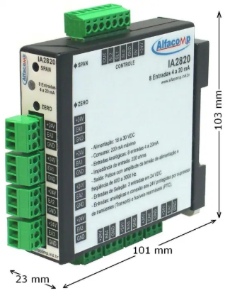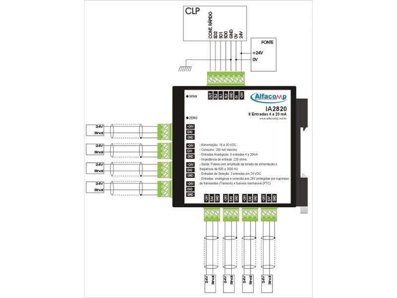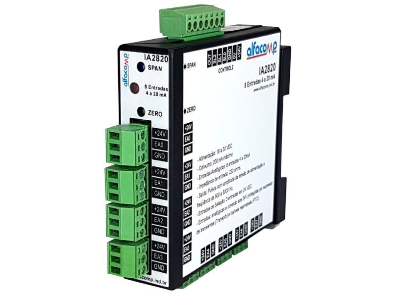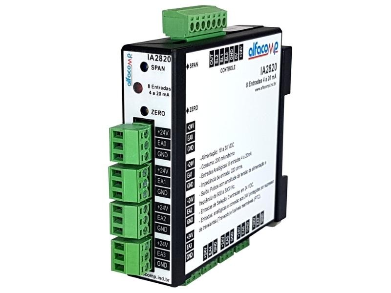 O conversor analógico IA2820 constitui um conversor multiplexado de sinais. Tem a capacidade de converter até 8 sinais analógicos de corrente de 4 a 20mA gerando uma saída em pulsos, de frequência proporcional à entrada selecionada. Sua utilização destina-se às configurações de CLP que possuem entrada de contagem rápida, viabilizando aquisição de até 8 sinais analógicos por módulo IA2820 a um preço extremamente competitivo. Para cada entrada analógica, o módulo é dotado de conexão destacável com: 24V, Sinal e GND. Dessa forma, o módulo funciona também como borneira economizando espaço e tempo de montagem.